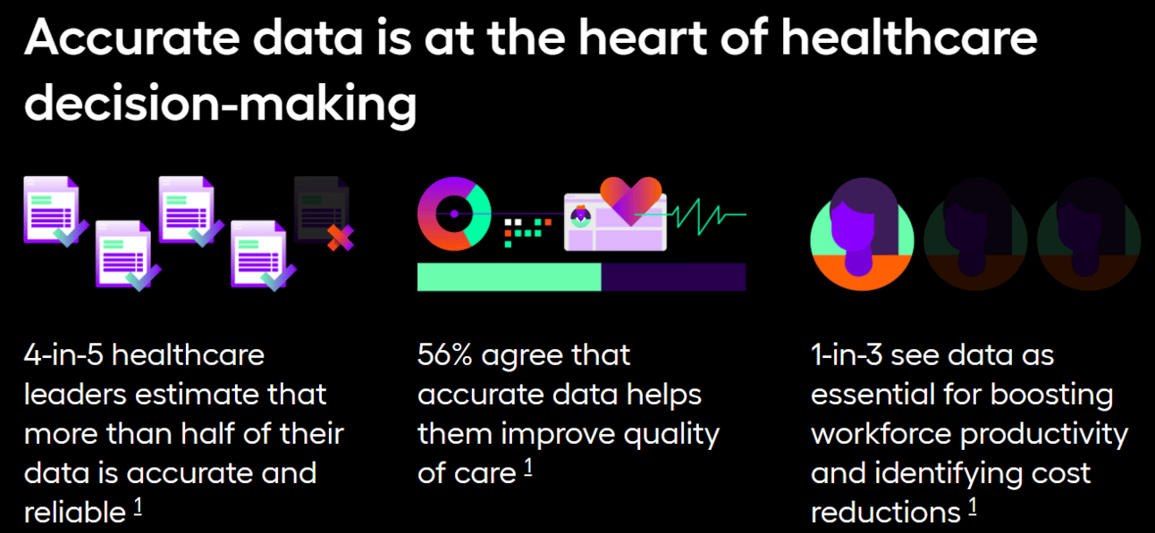Although four out of five healthcare leaders believe most of their data is accurate, 47% of healthcare data is underutilized when making clinical and business decisions. Healthcare leaders named enhancing data literacy (58%), using AI (47%), and addressing productivity challenges (34%) as key priorities to make data more usable. AI models are only as good as their inputs so ensuring proper data capture and the quality of data is foundational to the effectiveness of AI in healthcare. (link)