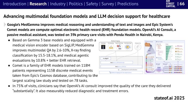 Healthcare was one of the biggest bright spots. Google’s AMIE outperformed primary care doctors in diagnostic reasoning and medical note-taking, while MedGemma boosted understanding across text, images, and X-rays. Epic’s Comet improved EHR accuracy, and OpenAI’s AI Consult, tested on 39,000 patient visits in Kenya, significantly raised care quality and cut diagnostic errors. (link)(linkedin)