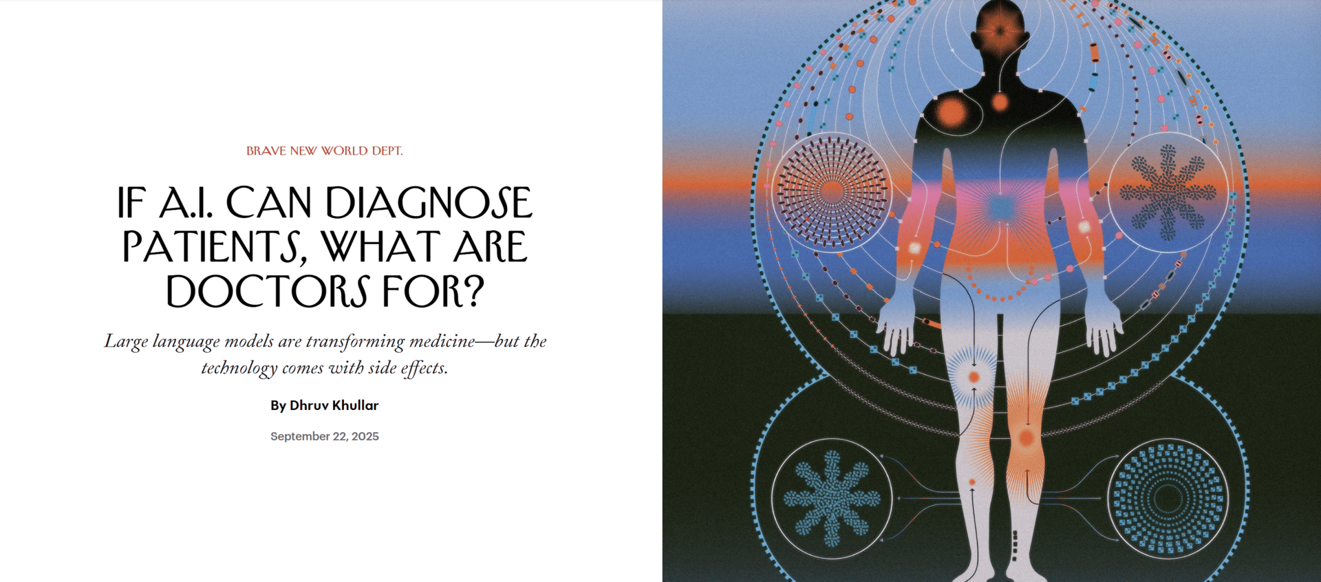 A widely discussed New Yorker article explored how large language models are getting better at medical reasoning, though with uneven results. The piece highlights systems like CaBot, which solved many classic diagnostic cases and often matched expert clinicians, alongside examples of everyday chatbots that still hallucinate, give unsafe advice, or risk eroding independent thinking if overused. The most promising approach seems to be “centaur” setups where AI and clinicians work together. In Kenya, for example, an assistive tool reduced diagnostic and treatment errors while helping frontline clinicians improve over time. AI can sift data, surface options, and prepare patients and doctors for better conversations. Humans still provide judgment, examination, liability, and the emotional elements of care. Used this way, AI looks less like a doctor replacement and more like a teammate that can lighten routine work and support safer decisions. Augment > replace. (link)