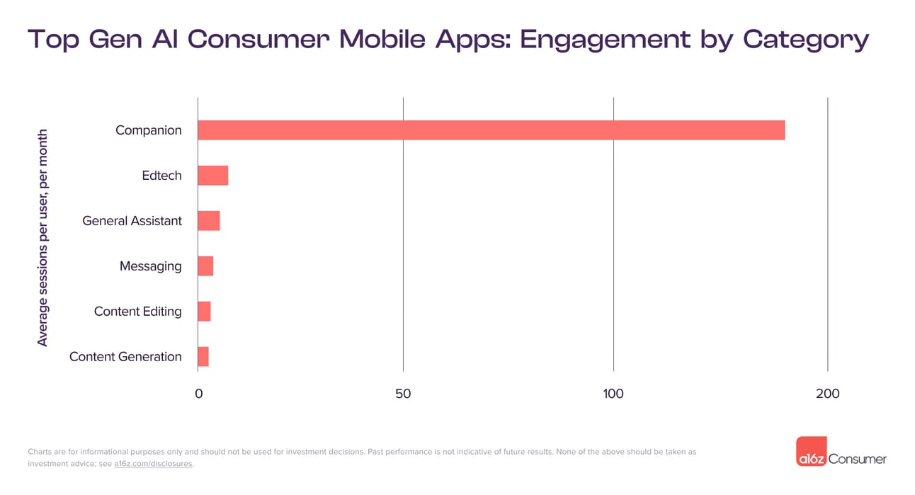 In this new era, AI companions are becoming a new normal. Companion mobile apps have unusually high engagement and the retention of these apps is truly insane. The character ai app sees nearly 300 sessions per user per month!