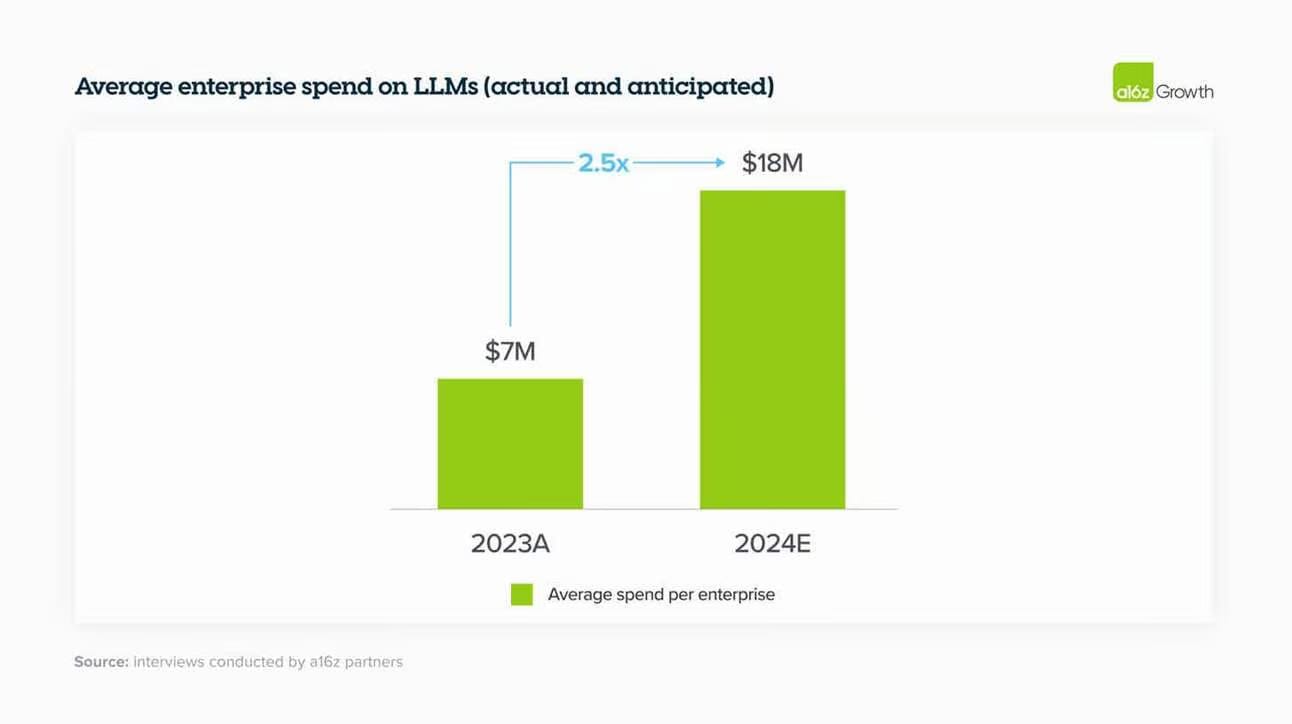 Enterprise spending on LLMs averaged $7M in 2023, with 2-5x budget increases planned for 2024.