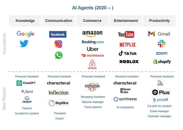 The history of internet applications has continuously evolved, from the era of websites in 2000s to mobile apps in 2010s. Now, we’re on the verge of a new phase in web interaction: AI agents. Generative AI has unlocked the ability to access all human knowledge and computers through natural language queries. This enables widespread availability to once exclusive services such as personal assistants, therapists, personal coaches, content creation, coding etc. Most consumer applications will soon have an AI agent, and many new use cases will emerge. Some healthcare-related favorites below: