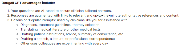 🔧 Dougall GPT: Dougall GPT, GPT technology for clinicians, allows providers to experiment with GPT technology, while also providing trusted sites and links to fact-confirm responses. (link)
